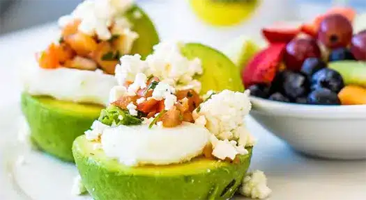 Avocado by Josh Collier | Jan 7, 2026 Avocado split halves, topped with pico de gallo, and feta cheese, served with hollandaise sauce and a choice of potato